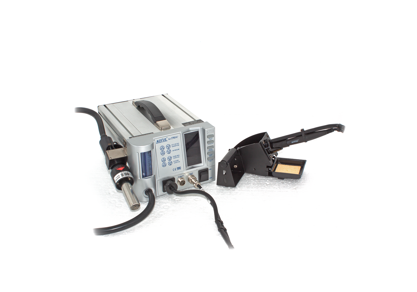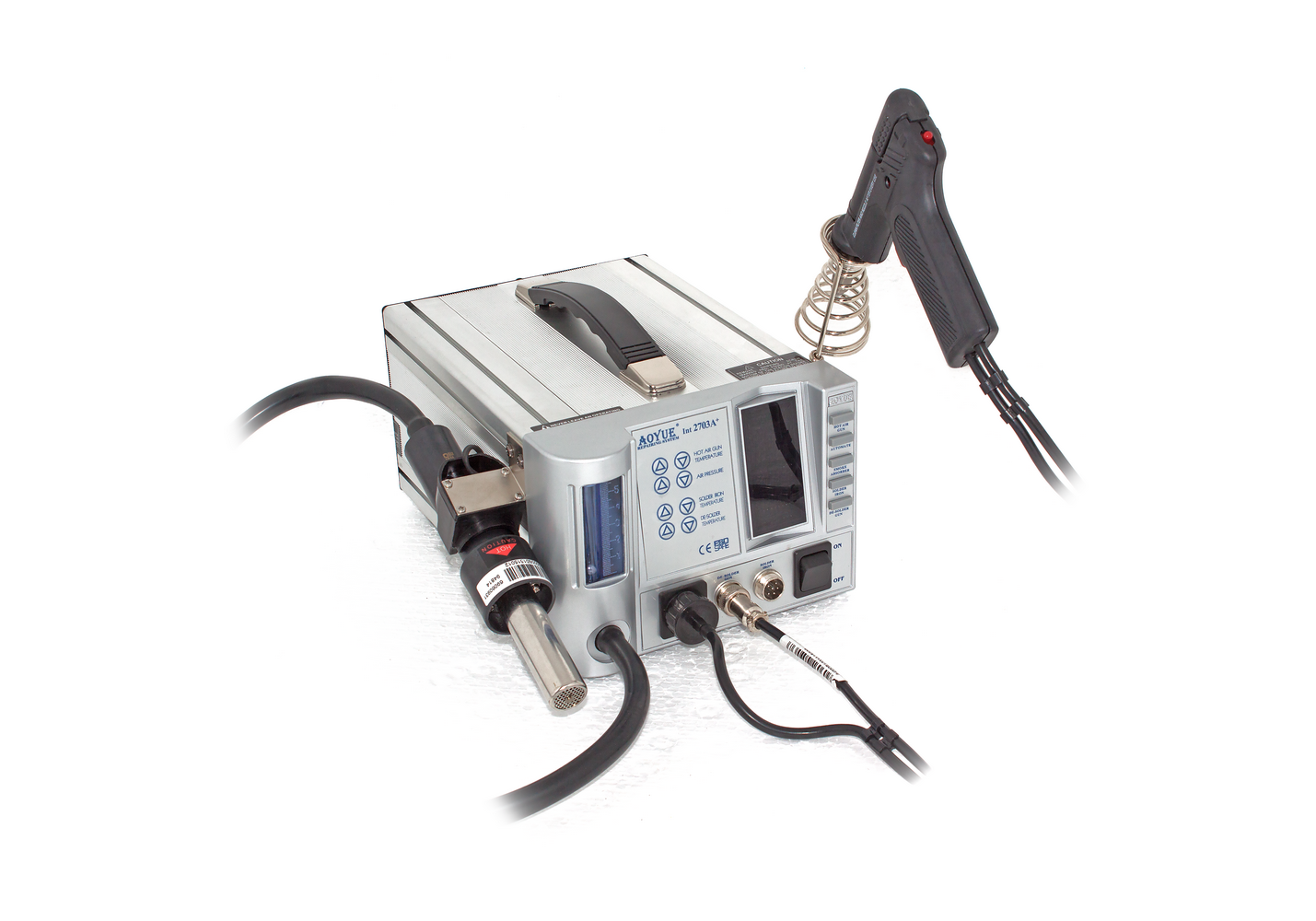 AOYUE 2703A+ – это мощная комбинированная ремонтная станция для бессвинцовой пайки, совмещающая в себе функции паяльника, дымопоглотителя и демонтажного пистолета, идеально подходит для мастерских и лабораторий. Термовоздушная ремонтная станция AOYUE 2703A+ обладает системой Dual Port, позволяющей одновременно использовать паяльник для бессвинцовой пайки и демонтажный пистолет.
