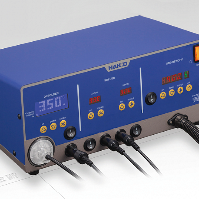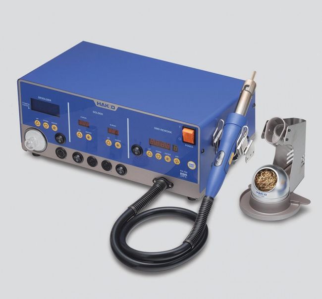 Ремонтная станция HAKKO FR-702 позволяет проводить различные виды паяльных, демонтажных и ремонтных работ, благодаря набору подключаемых инструментов. Помимо демонтажного пистолета мощностью 140 Вт, паяльника типа M и термофена большой мощности (670 Вт) с интенсивным воздушным потоком, к станции можно подключить еще 4 инструмента. Наконечник и нагревательный элемент, можно заменить по отдельности, что значительно снижает расходы на компоненты, по сравнению с использованием наконечника композитного типа.