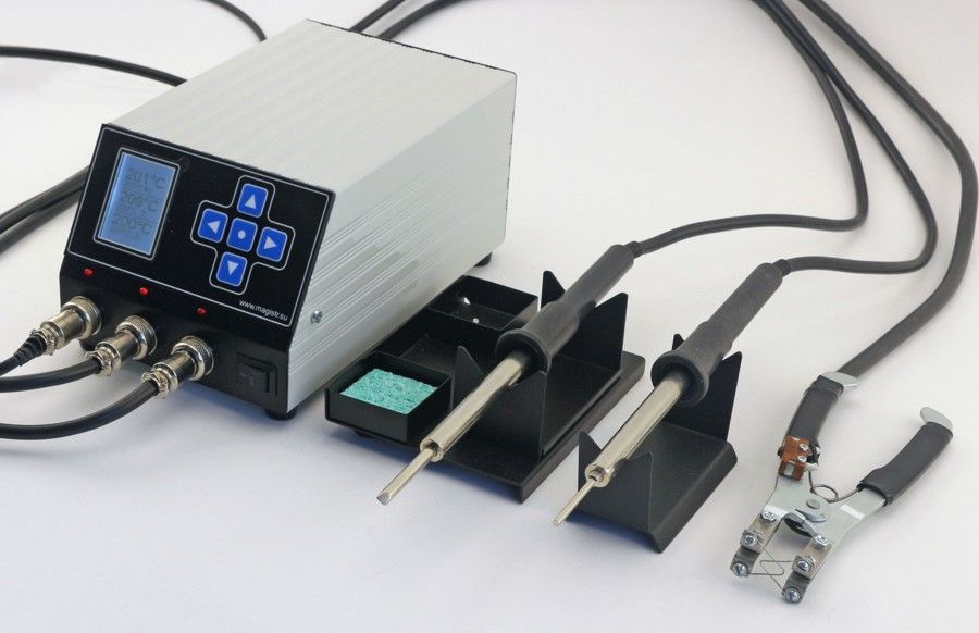 Паяльная станция «Магистр Ц20-ТриК-О» предназначена для одновременного управления нагревом до двух ручных паяльных инструментов и одним инструментом термозачистки проводов. Каждому инструменту задается своя температура. Имеется дежурный режим с пониженной температурой.