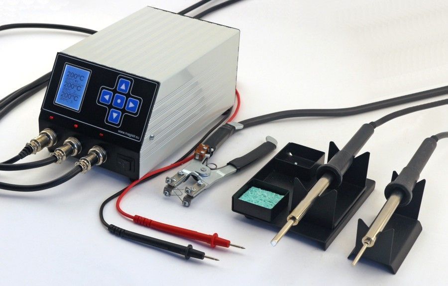 Паяльная станция «Магистр Ц20-ТриК-О-М» предназначена для одновременного управления нагревом до двух ручных паяльных инструментов и одним инструментом термозачистки проводов. Каждому инструменту задается своя температура.