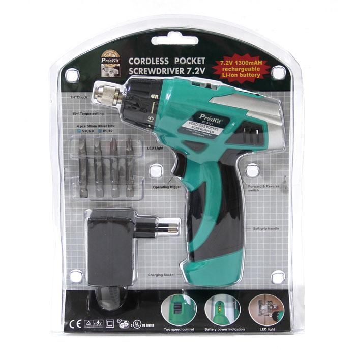 ProsKit PT-0721F — карманный аккумуляторный мини-шуруповерт с двумя скоростями вращения и литий-ионным аккумулятором.
