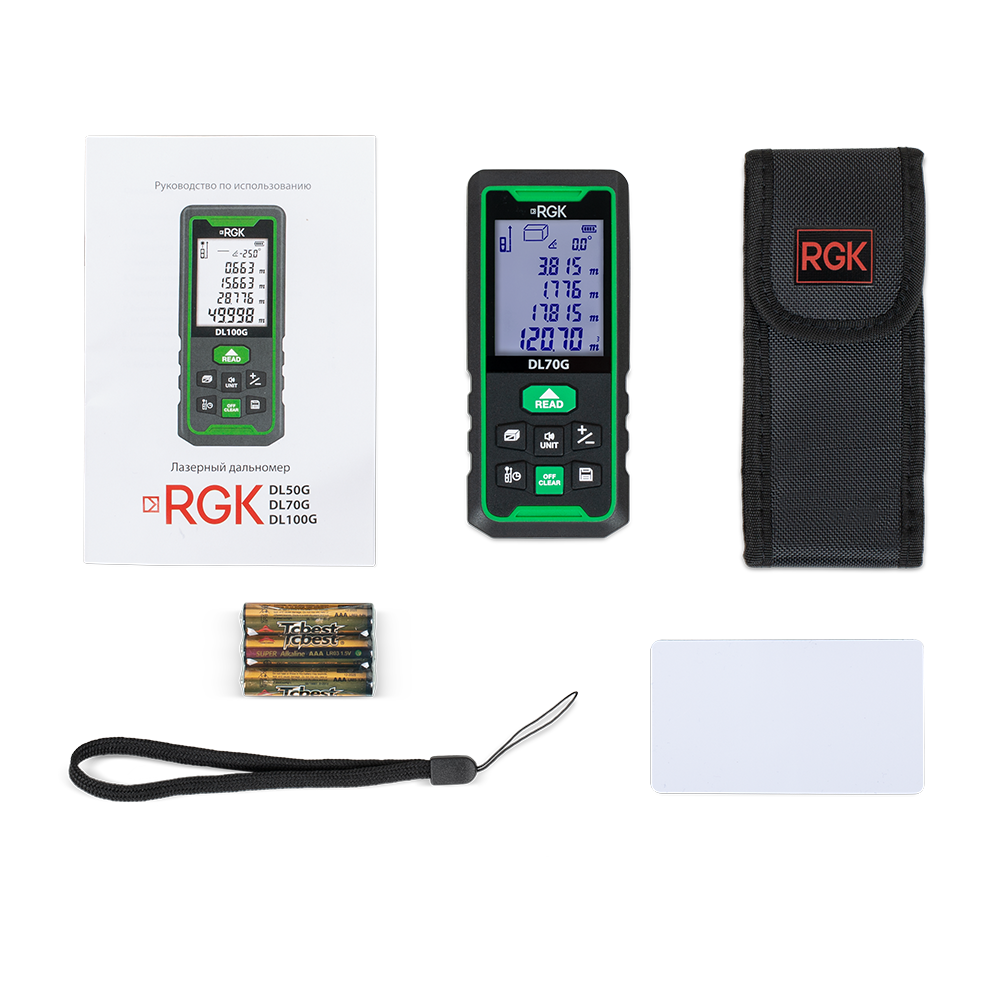 Лазерный дальномер RGK DL70G - зеленый луч служит для измерения расстояний, длин, высот, площадей и объемов. Рабочий диапазон составляет 70 м при погрешности ± 2 мм.