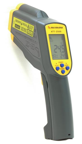 Пирометр АТТ-2509 представляет собой высокотемпературный бесконтактный измеритель температуры. АТТ-2509 позволяет измерять температуру контактным и бесконтактным способом, имеет большое оптическое разрешение, регулируемый коэффициент излучения, возможность удержания показаний, измерение минимального, максимального, среднего и относительно значений, а также сигнализацию выхода за пороговые значения температуры.