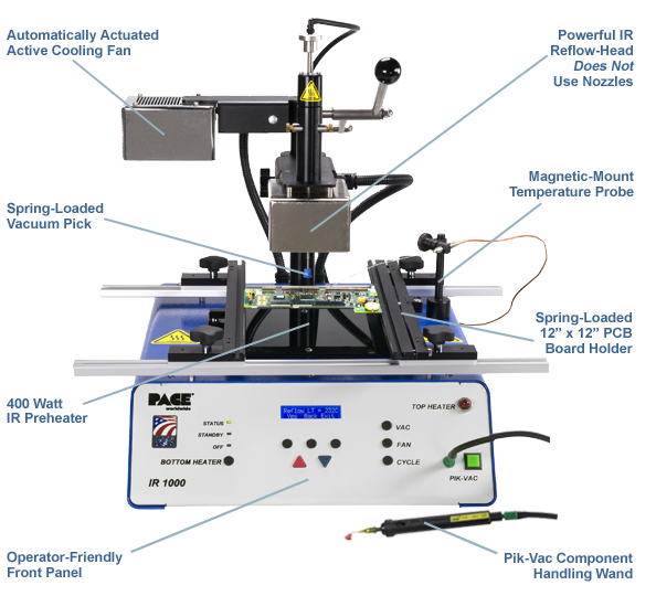 IR1000 - недорогая, гибкая инфракрасная станция для ремонта или монтажа BGA, QFP, SOIC, PLCC, MLF, LCCC, TSOP, QFN. Станция оснащена верхним инфракрасным нагревателем мощностью 500Вт, для которого не нужны сопла или диафрагмы. Станция идеально подойдет для ремонта или мелкосерийной сборки. Система не требует внешнего компьютера и довольно проста в управлении. Однако вы может воспользоваться специальным режимом обучения, который используется для пайки по термопрофилю. Возможно подключение к ПК для более точной настройки и наглядности процесса пайки.