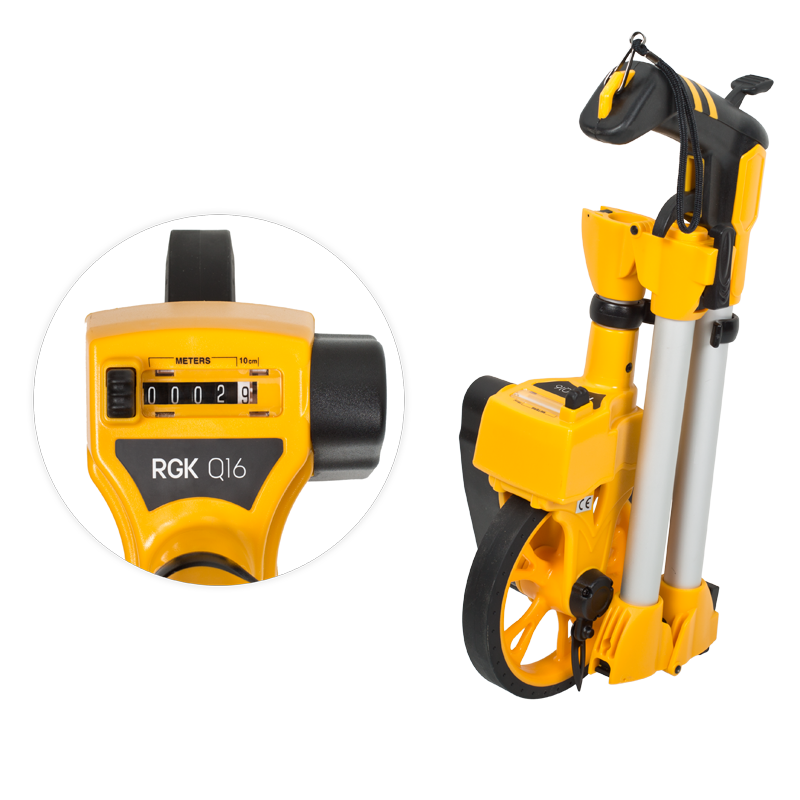 Дорожное колесо RGK Q16 диаметром 160 мм и измеряет расстояния там, где невозможно или нецелесообразно применять мерные ленты или лазерные дальномеры, например, при разметке дорожного полотна или фиксировании параметров при ДТП. Прибор удобен при измерениях при неблагоприятных погодных условиях за счет надежного механического счетчика.