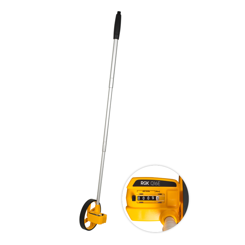 Дорожное колесо RGK Q16E диаметром 160 мм изготовлено из алюминиевого сплава и имеет меньший вес, по сравнению с похожим прибором RGK Q16. Прибор удобен при измерениях при неблагоприятных погодных условиях за счет надежного механического счетчика.