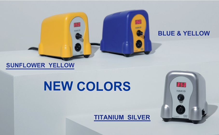 Станция имеет 3 вариации расцветки (желто-белый, сине-желтый, серебристый), но в любой комплектации подставка паяльника идет серебристого цвета.