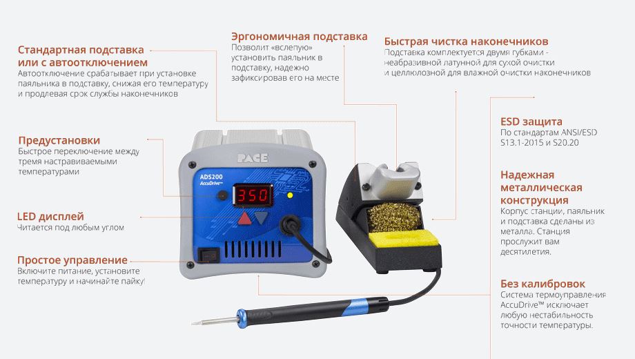ADS200 - мощная, но недорогая профессиональная цифровая паяльная станция. Она подойдёт мастеру по ремонту сотовых телефонов и компьютерной техники, разработчикам электроники, ремонтным инженерам, любителей и профессиональных монтажников.