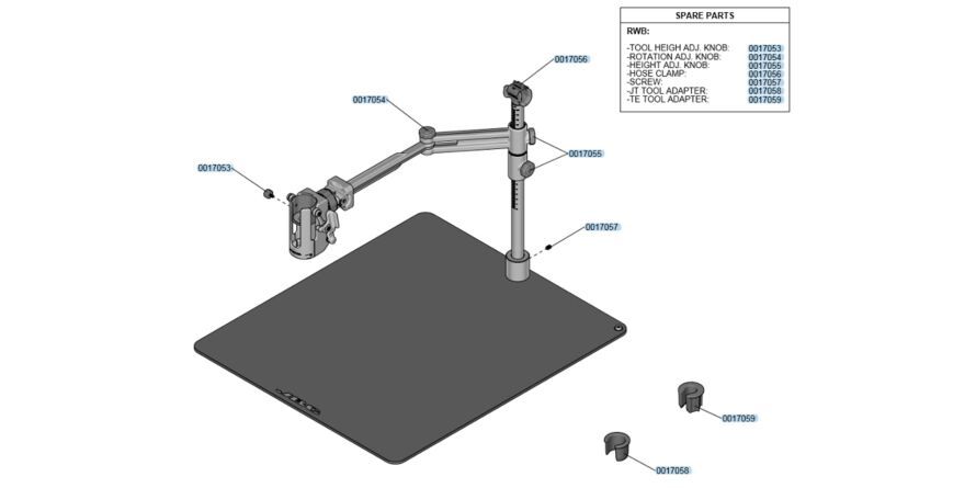 Штатив рассчитан на работу с термофенами, когда нужна "дополнительная рука". Благодаря специальному переходнику, штатив может использоватся со станциями JTSE и TESE. Подставка штатива спроектирована для работы с термостолами PHSE. Штатив регулируется по вертикали и горизонтали, для удобства нанесены шкалы. Крепление наверху штатива предназначено для фиксации шлангов паяльных инструментов.
