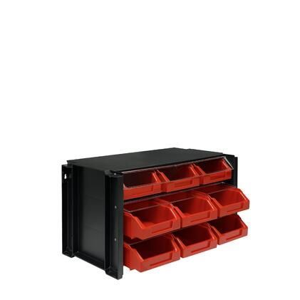 Они могут подвешиваться на стену и устанавливаться друг на друга, обеспечивая отличную организацию хранения. В комплект входит 9 выдвижных лотка с возможностью установки перегородок.