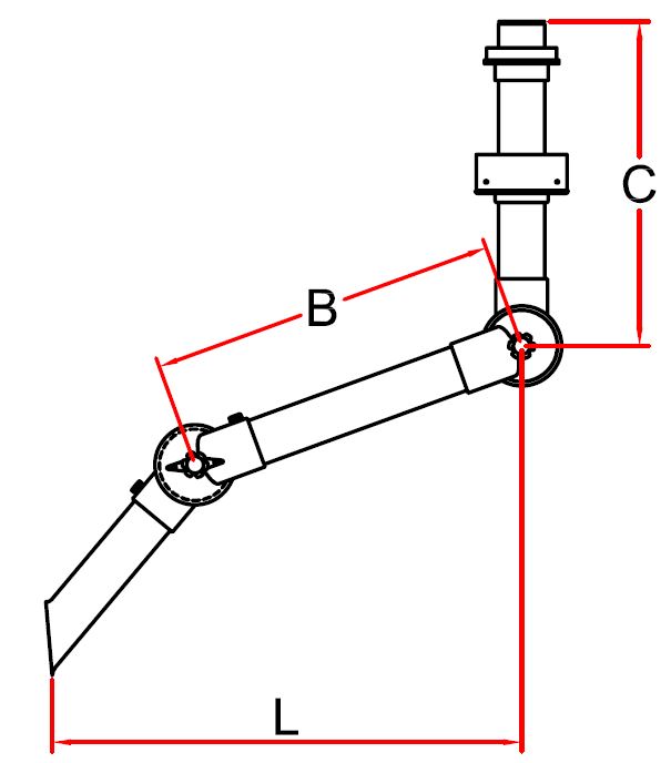 Стандартные дымоприемники System 50 возможно заказать в 3-х различных цветах шарниров - красный, белый или черный. Код цвета нужно добавить к основному артикулу «-4», «-5» или «-050». Дымоприемник Alsident состоит из 3-х основных элементов: шарнирный дымоприемник, крепление и раструб дымоприемника.