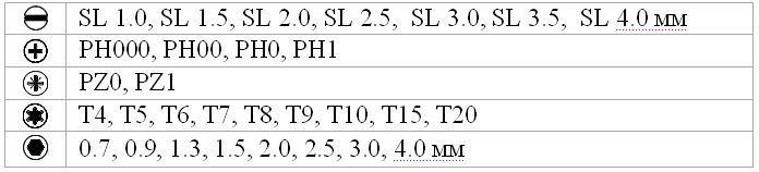 | Типы шлицов | SL, PH, PZ, Torx, HEX |