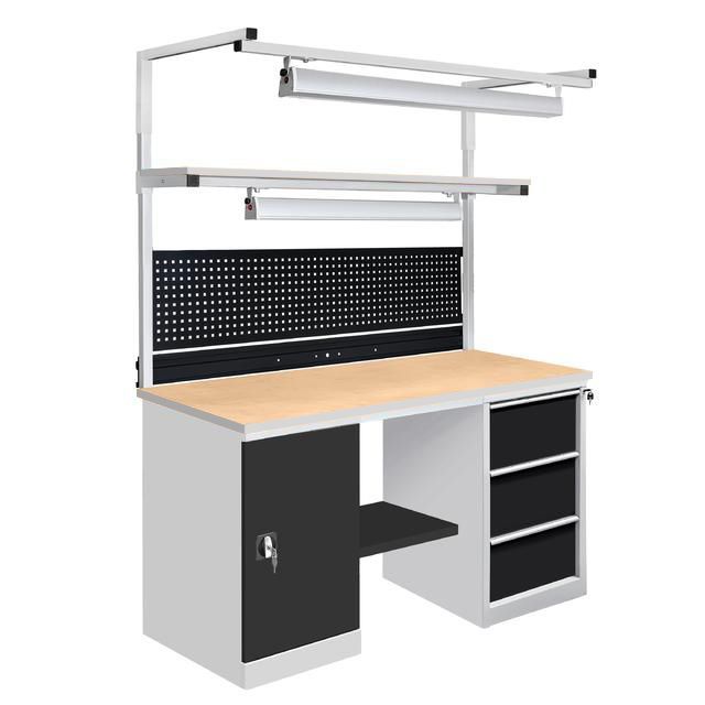 На тумбах установлен ригельный замок с ручкой (в комплекте с 2 ключами) для индивидуального доступа к инструментам и принадлежностям. Ручки ящиков тумбы ТС-3 изготовлены из алюминиевого профиля с анодированным покрытием и боковыми пазами для установки обозначения (маркировки) ящиков по их прямому назначению (подразделение организации, документация, инструменты, материалы и т.д.). В зависимости от габаритов используемых инструментов, материалов и оснастки возможно подобрать тумбу верстака с разным количеством ящиков. Нижняя полка верстака изготовлена из металла для устойчивого положения верстака и позволяет организовать хранение материалов.