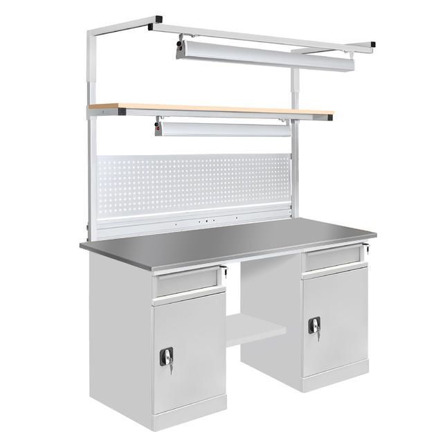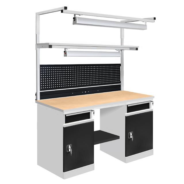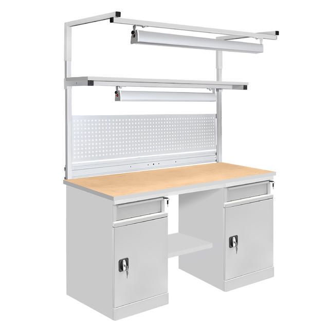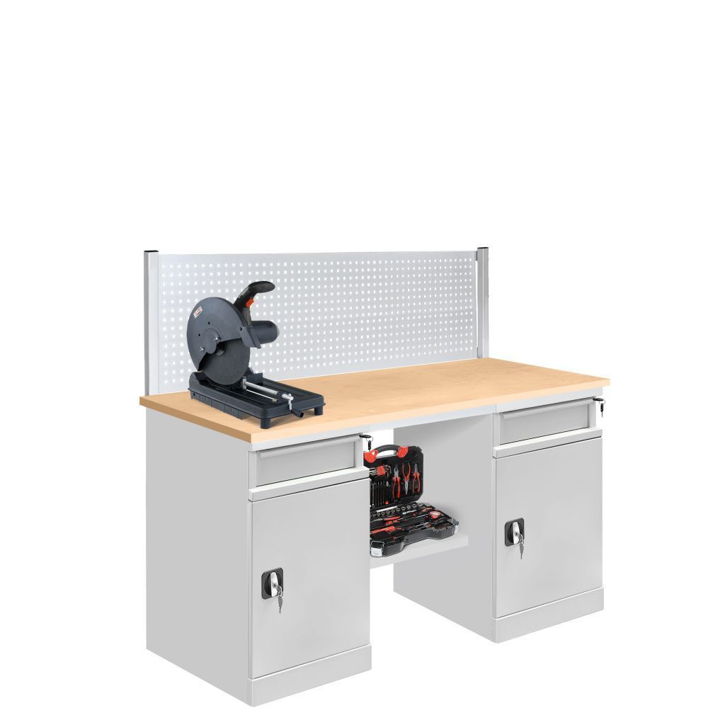 На тумбах установлен ригельный и центральный замок для индивидуального доступа. Ручки ящика тумбы изготовлены из алюминиевого профиля с анодированным покрытием и боковыми пазами для установки обозначения (маркировки) ящиков по их прямому назначению (подразделение организации, документация, инструменты, материалы и т.д.). В зависимости от габаритов используемых инструментов, материалов и оснастки возможно подобрать тумбу верстака с разным количеством ящиков. Нижняя полка верстака изготовлена из металла для устойчивого положения верстака и позволяет организовать хранение материалов.