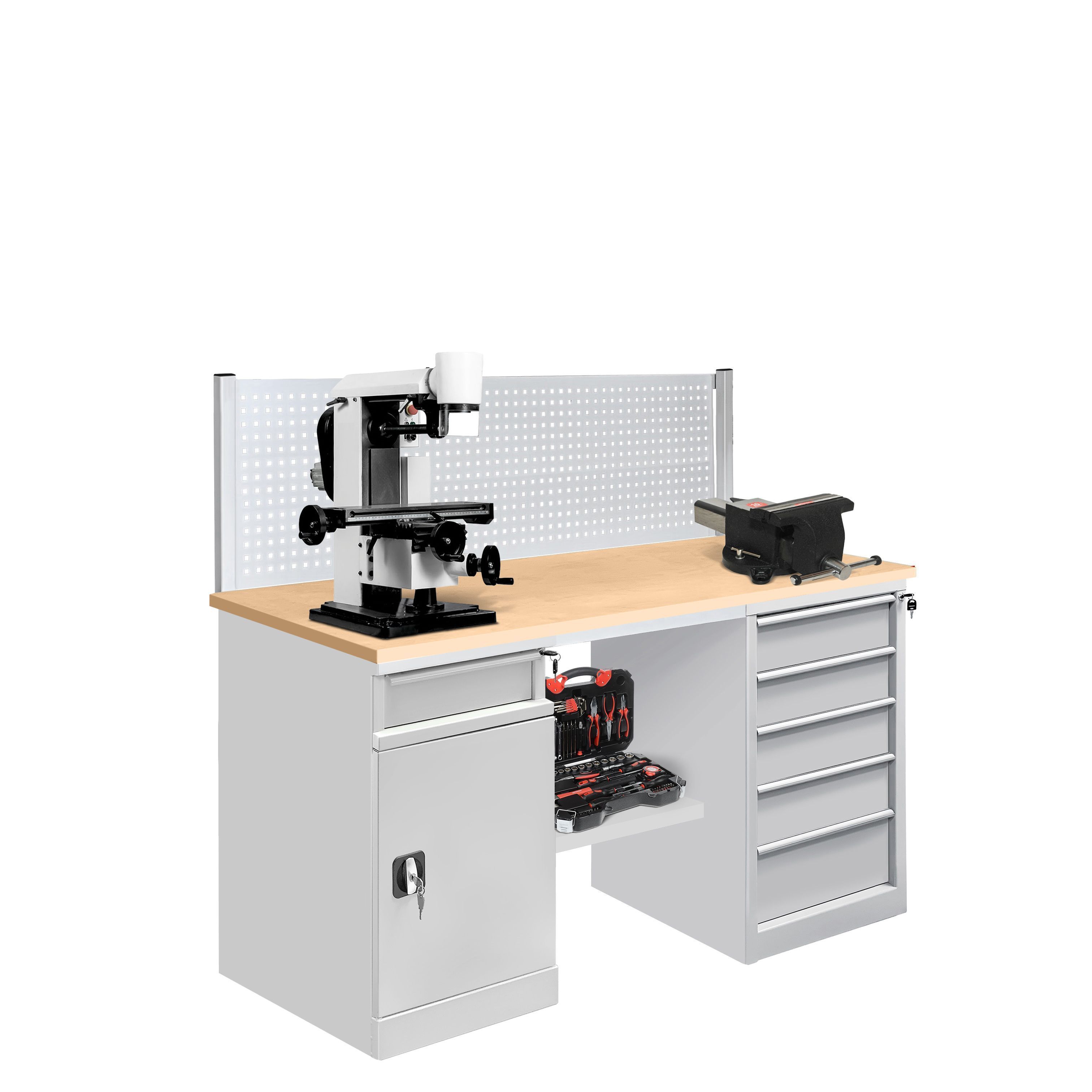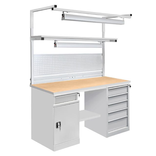 На тумбах установлен центральный и ригельный замок для индивидуального доступа. Ручки тумбы ТС-5 изготовлены из алюминиевого профиля с анодированным покрытием и боковыми пазами для установки обозначения (маркировки) ящиков по их прямому назначению (подразделение организации, документация, инструменты, материалы и т.д.). В зависимости от габаритов используемых инструментов, материалов и оснастки возможно подобрать тумбу верстака с разным количеством ящиков. Нижняя полка верстака изготовлена из металла для устойчивого положения верстака и позволяет организовать хранение материалов.