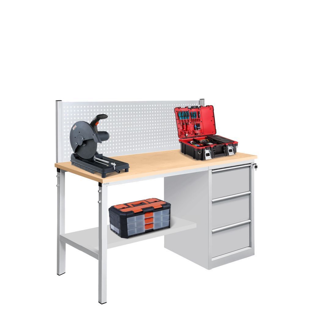 Тумба верстака имеет 3 ящика большого размера, что позволяет организовать в них хранение крупных материалов и инструментов. На тумбе установлен центральный замок с ручкой (в комплекте с 2 ключами) для индивидуального доступа к инструментам и принадлежностям. Ручки изготовлены из алюминиевого профиля с анодированным покрытием и боковыми пазами для установки обозначения (маркировки) ящиков по их прямому назначению (подразделение организации, документация, инструменты, материалы и т.д.). Нижняя полка, изготовленная из металла для устойчивого положения верстака, позволяет организовать хранение материалов.